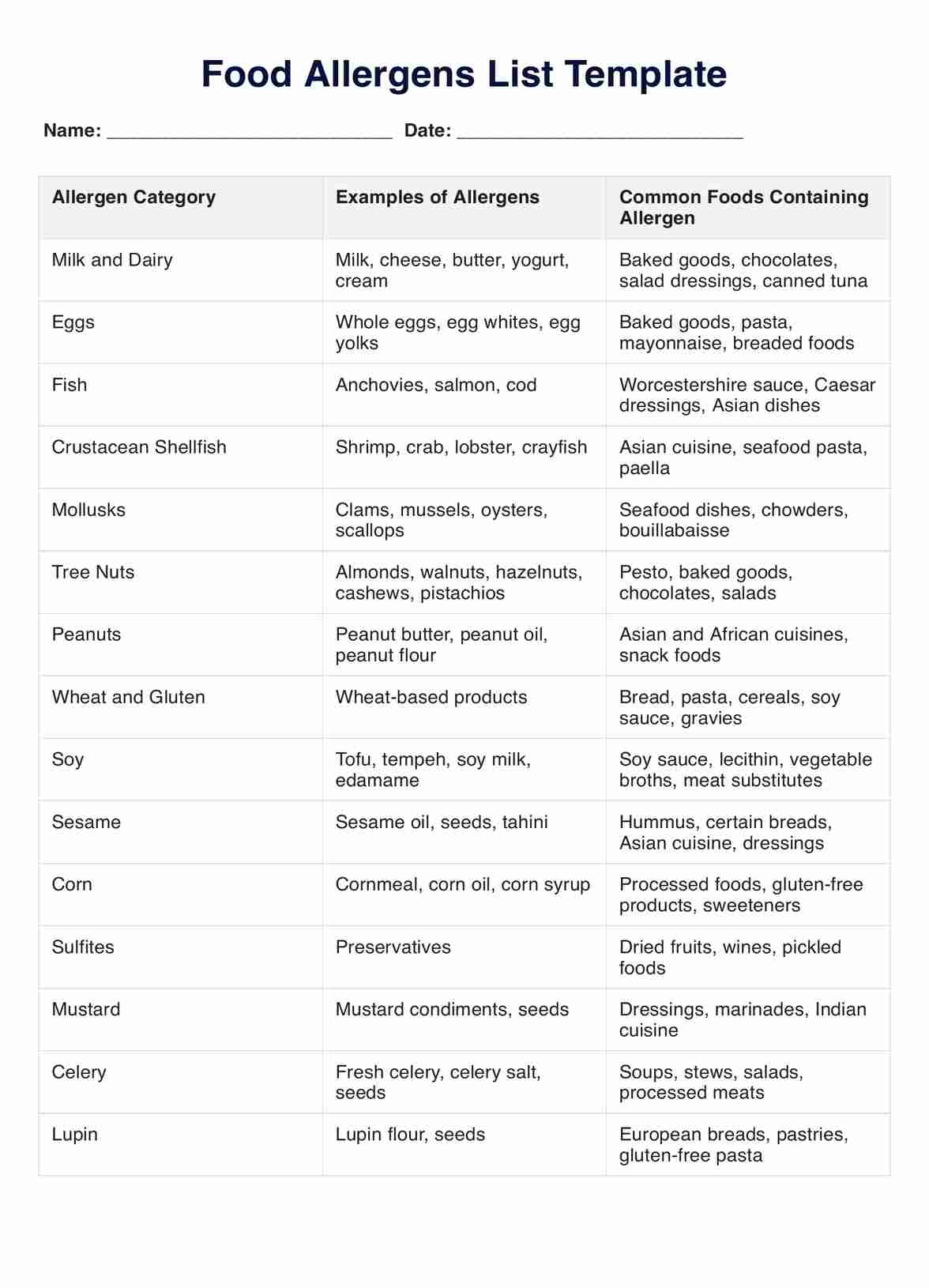 Food Allergens List Template U0026 Example Free PDF Download