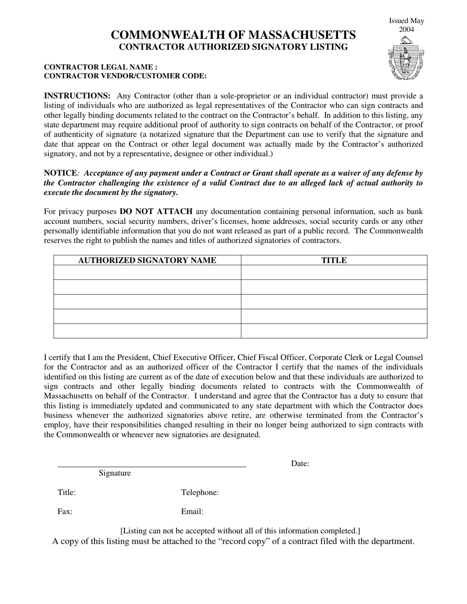 Massachusetts Contractor Authorized Signatory Listing Fill Out Sign Online And Download PDF Templateroller