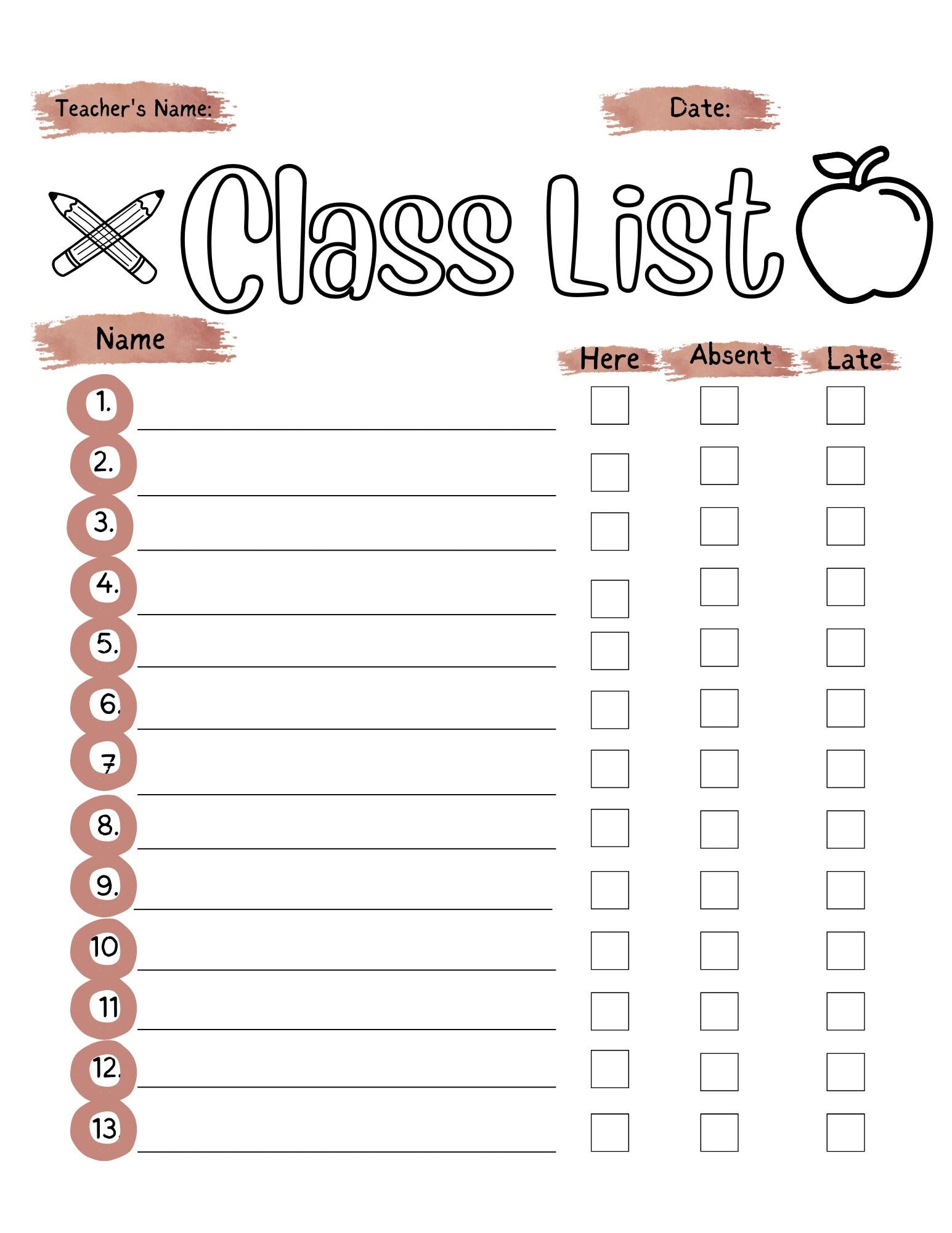Download Printable Class List Template PDF