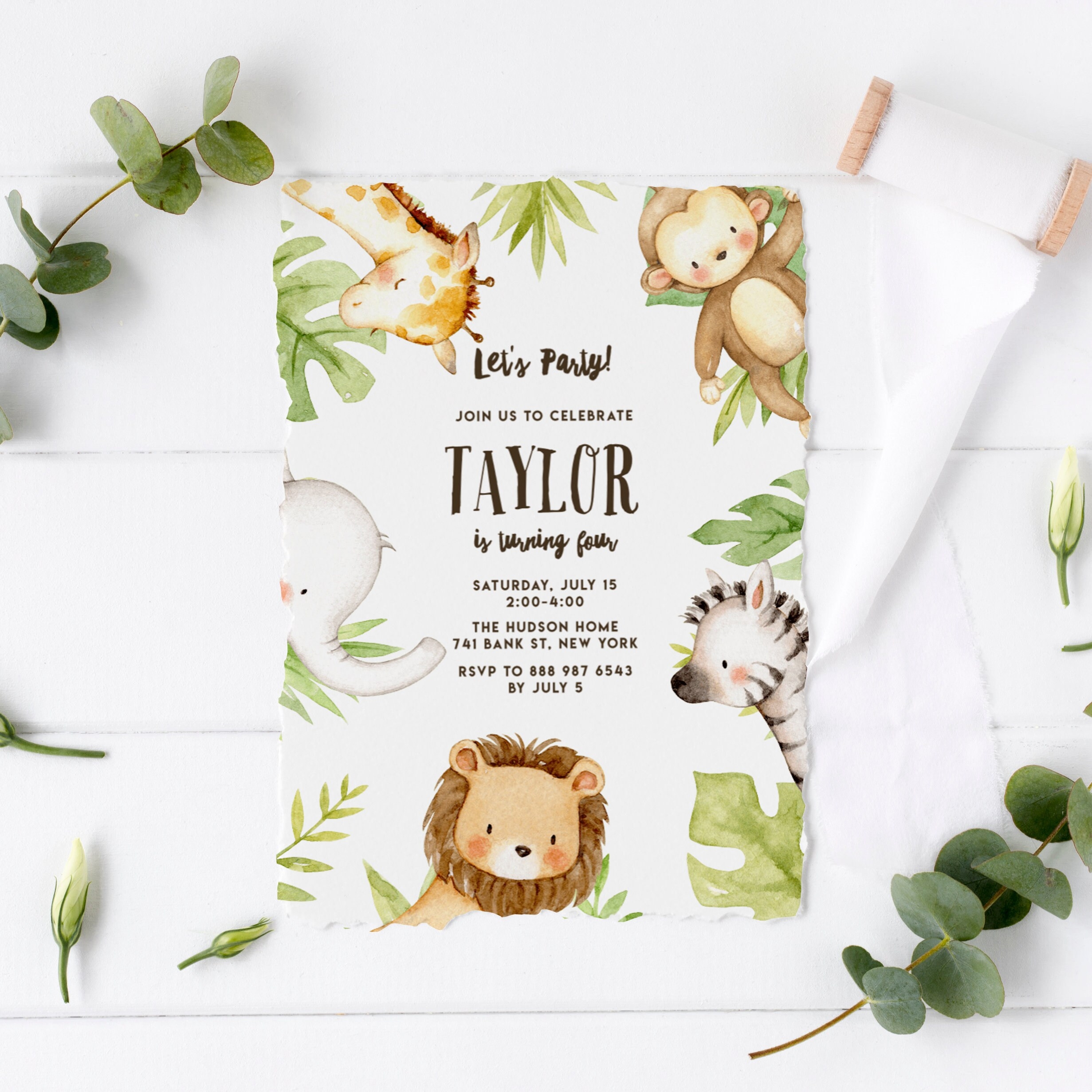 Printable Safari Birthday Party Invitation Template Cute Watercolor Safari Animals DIY Editable Jungle First Birthday Invite SF87 Etsy