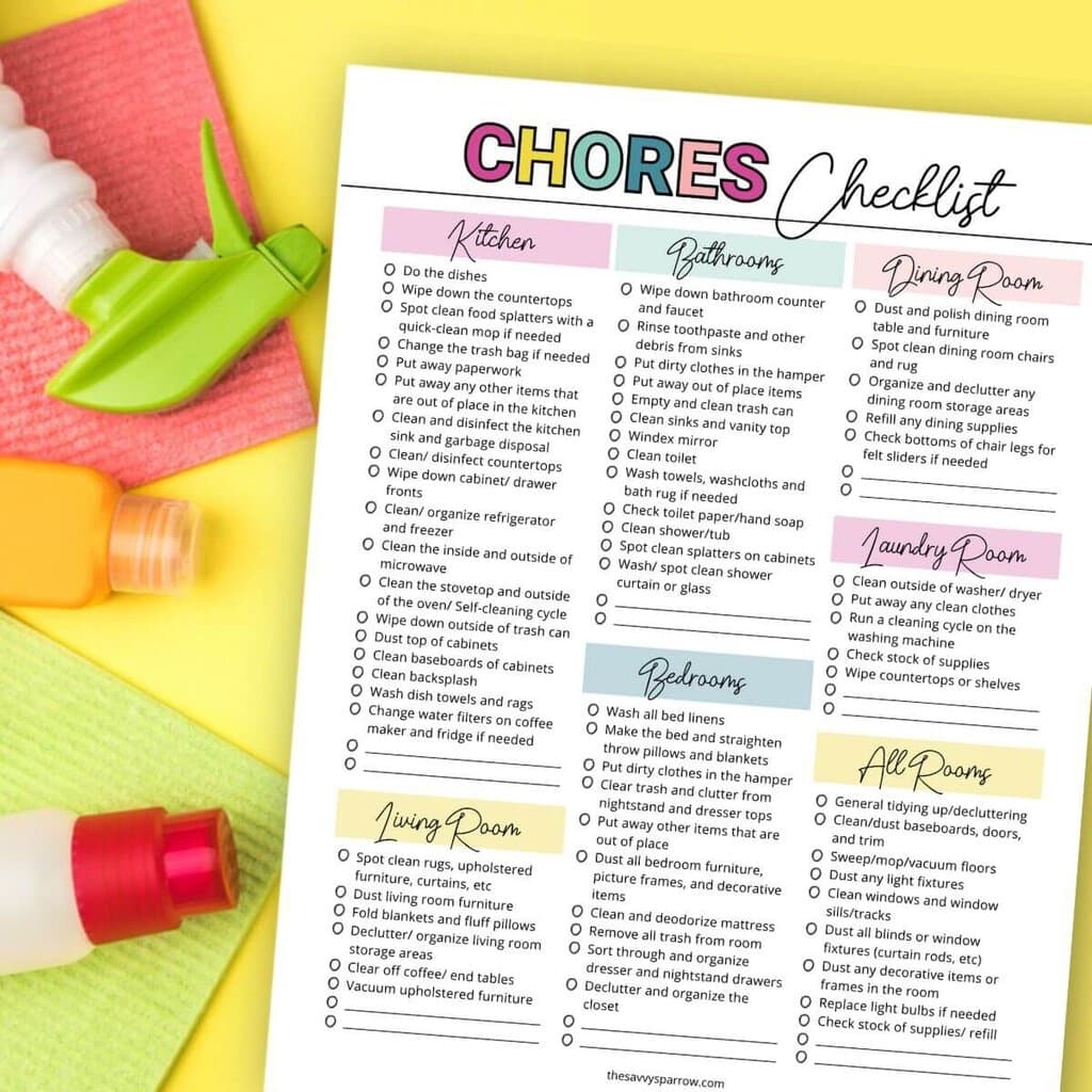 Be sure to include specific tasks for each room in your home, such as cleaning the bathroom, organizing the kitchen, and decluttering the living room. This will help you stay organized and focused as you work your way through your chore list.