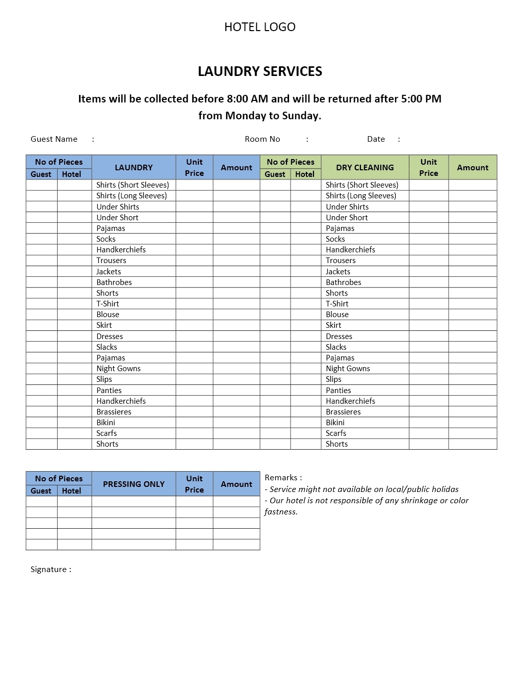 Hotel GUEST LAUNDRY LIST Printing From 48 With Free Delivery