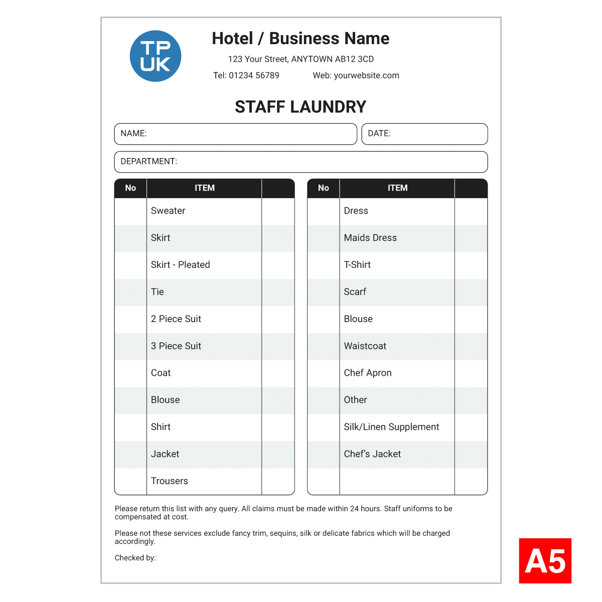 Personalised STAFF LAUNDRY Lists Printed For Hotels From 48