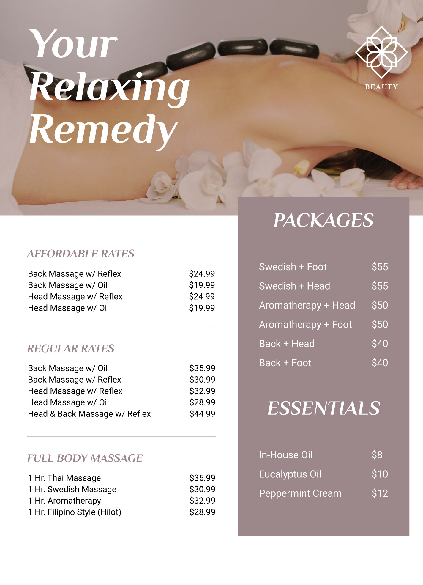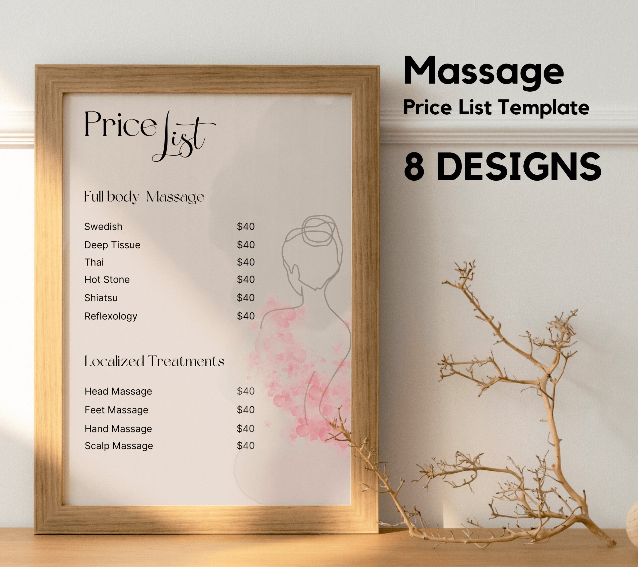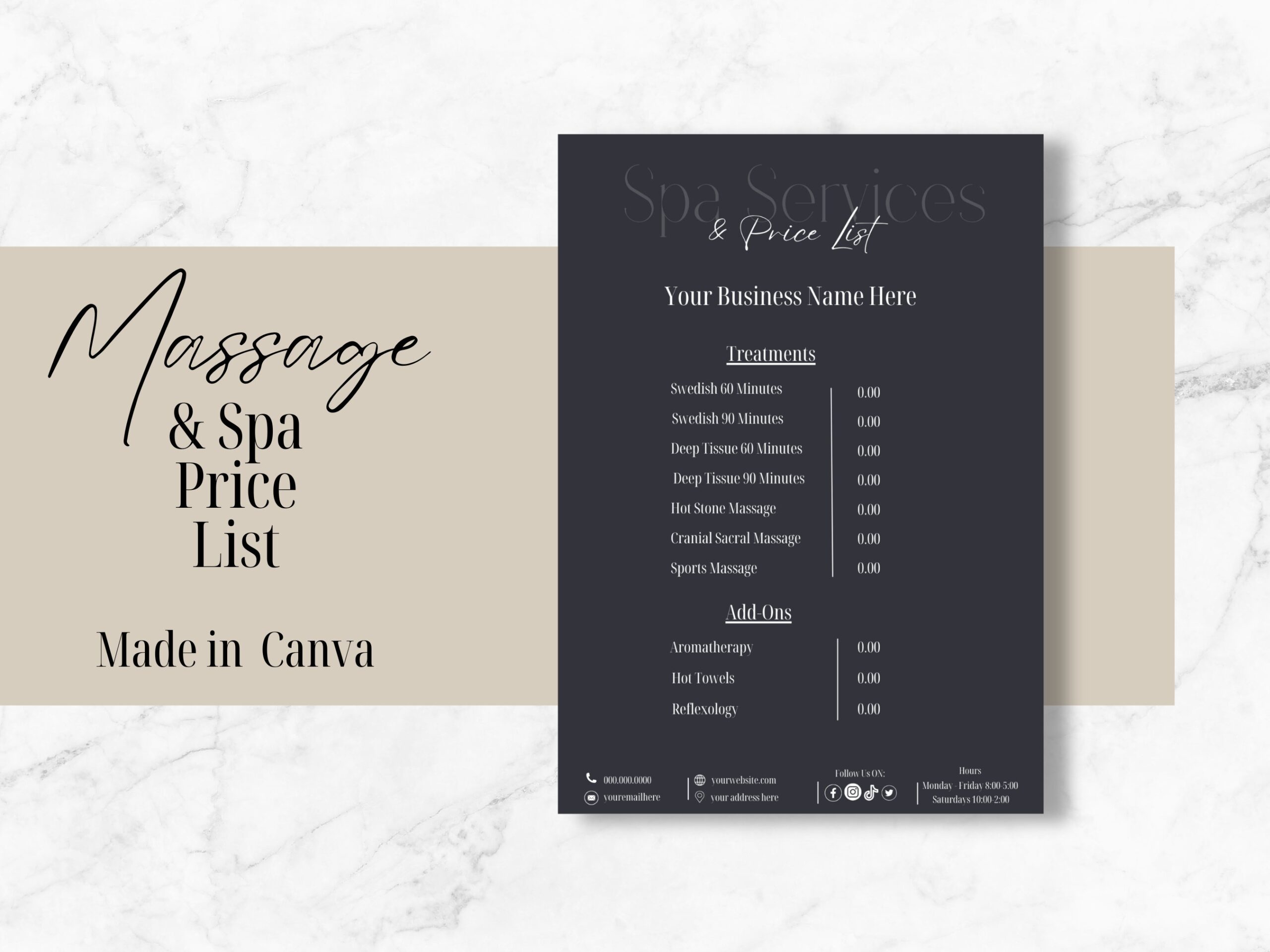 Whether you offer Swedish, deep tissue, hot stone, or other types of massages, our template can be easily tailored to suit your specific services. Impress your clients with a well-designed and informative price list that reflects the quality of your services.