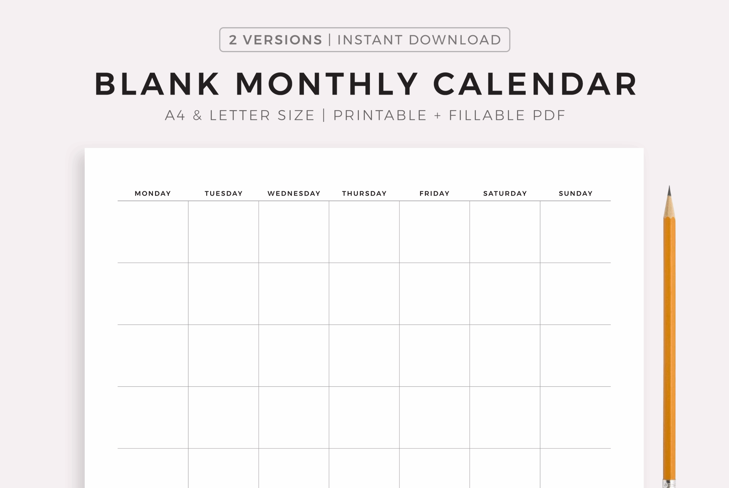 Printable Blank Calendar Works With Any Month Any Year Instant Digital PDF Download Minimal Simple Style Landscape Monday And Sunday Start Etsy