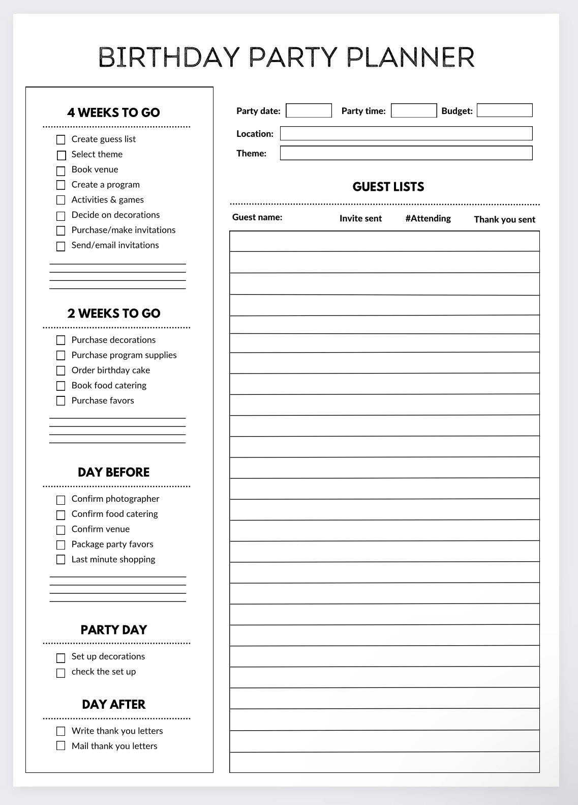 From creating a guest list to choosing decorations and planning the menu, a party planning to-do list template can help you keep track of all the important details. You can easily check off tasks as you complete them and make sure nothing is forgotten.