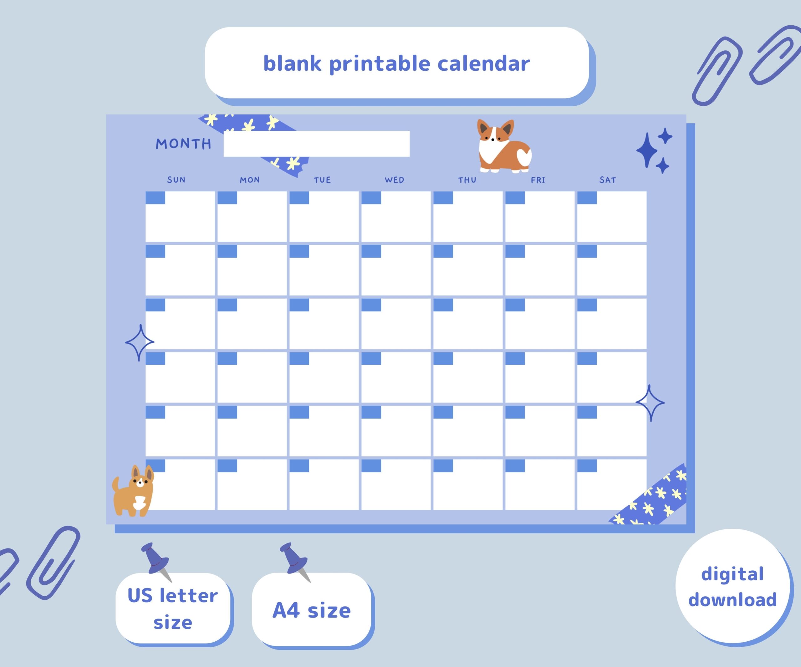 Blank Monthly Calendar Cute Dog Calendar Cute Stationery Instant Download Digital Download Dog Calendar Printable Blank Calendar Etsy