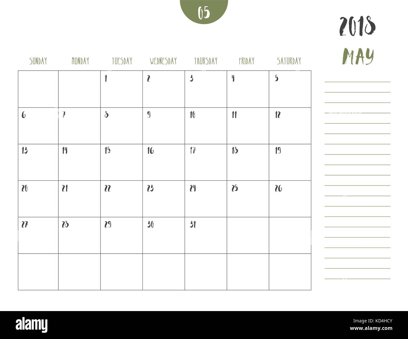 Vector Of Calendar 2018 May In Simple Clean Table Style With Note Line In Earth Tone Color Theme full Size 21 X 16 Cm Week Start On Sunday Stock Vector Image U0026 Art Alamy