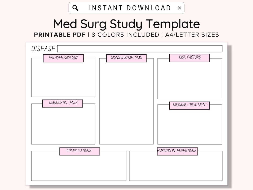 Med Surg Study Template Printable Pathophysiology Template Medical Surgical Nursing Disease Process Template Concept Map Nursing PDF Etsy