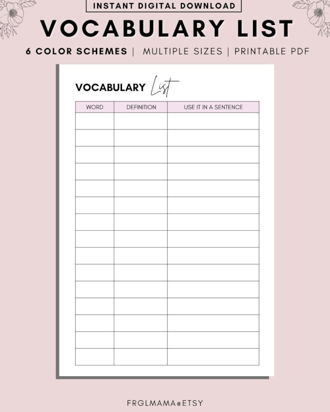 Vocabulary List Printable Planner Inserts Vocabulary List Word