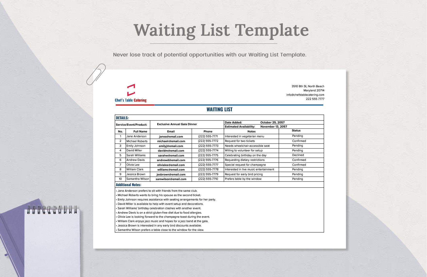 With a wait list template, you can easily keep track of customers waiting for a table, appointment, or service. This simple tool can streamline your operations and improve customer satisfaction by reducing wait times and minimizing confusion.