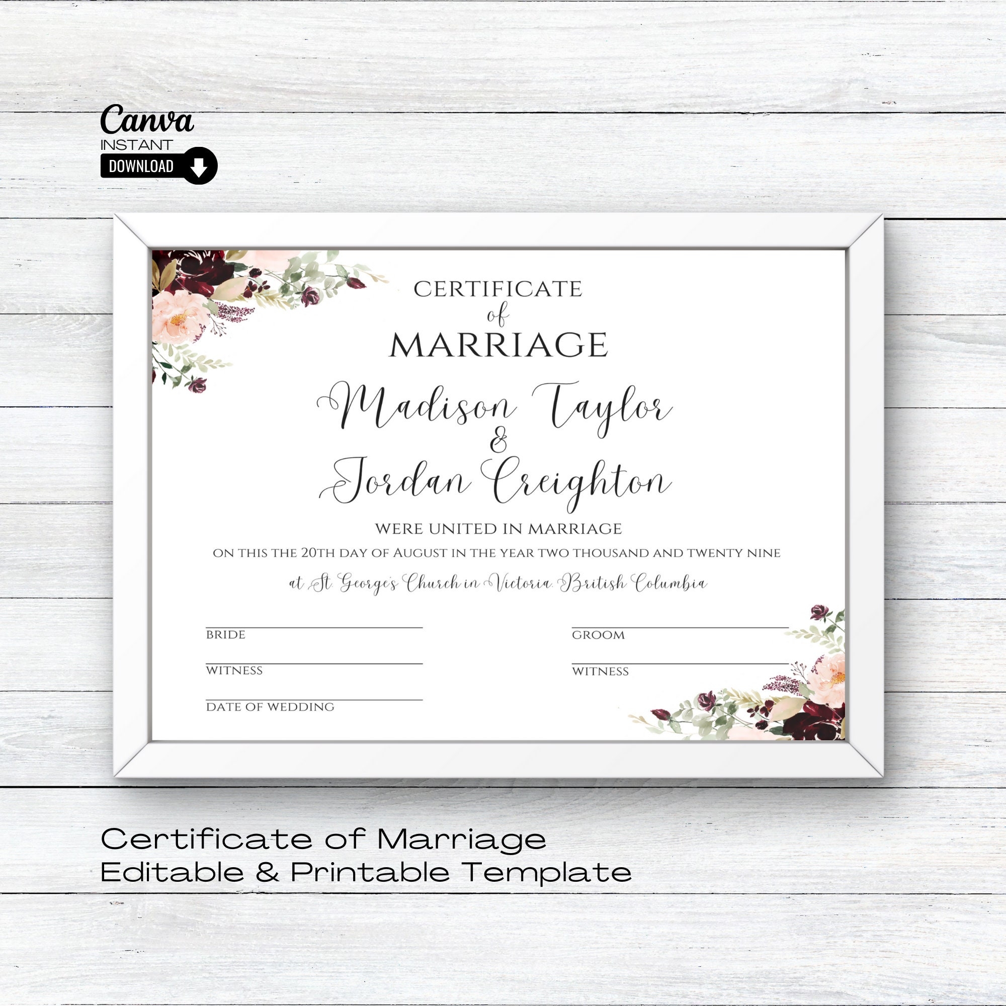 Editable Wedding Certificate Template Marriage Certificate Printable Wedding Keepsake Editable Certificate Certificate Marriage Canva Etsy