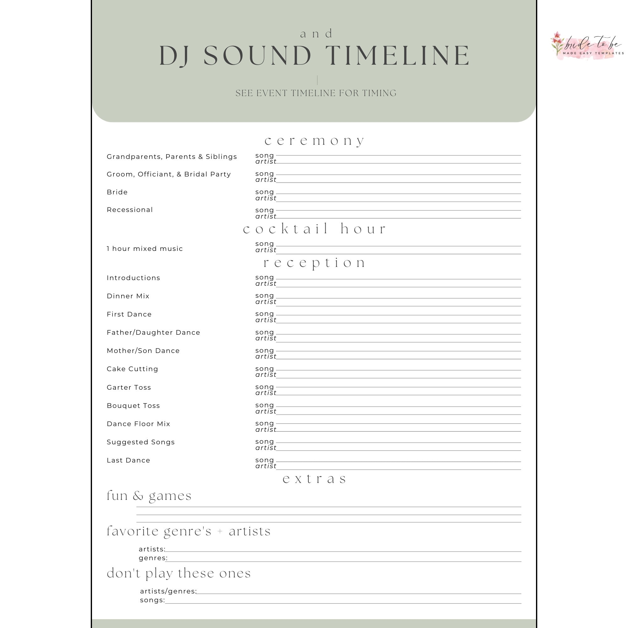 Sage Wedding DJ Timeline Template DJ Wedding Music Planning Guide Wedding Song List Template Etsy